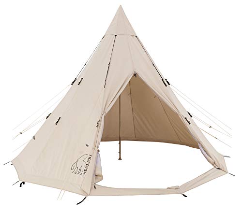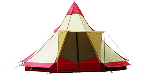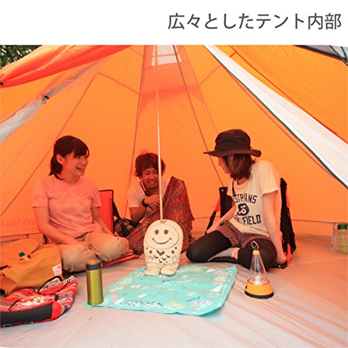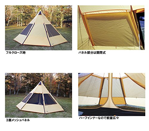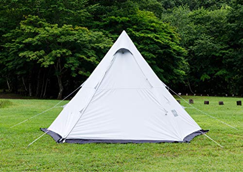 <商品スペック> カラー:オフホワイト 定員:8~10人(個室を付けた場合は、4人) サイズ(使用時):400x400x270cm(高さ 275cm) 収納サイズ:99x36cm 重量:18kg 素材(フライシート):ポリエステル65%、コットン 35% 耐水圧(フライシート):350mm ポール:スチール製1本 ペグ:スチール製Vペグ28本 フロアー(床付):ターポリン防水100% (取り外し不可)(別売)