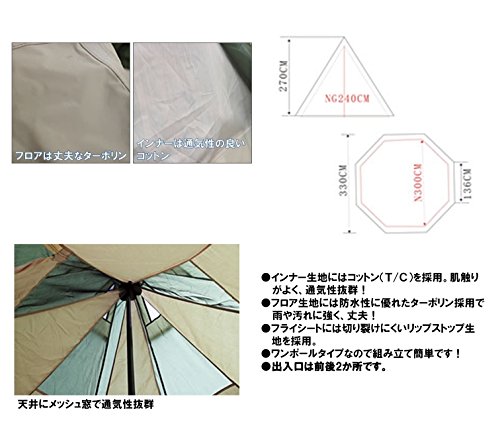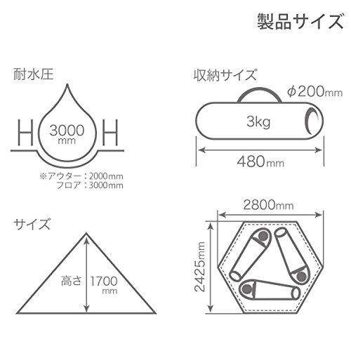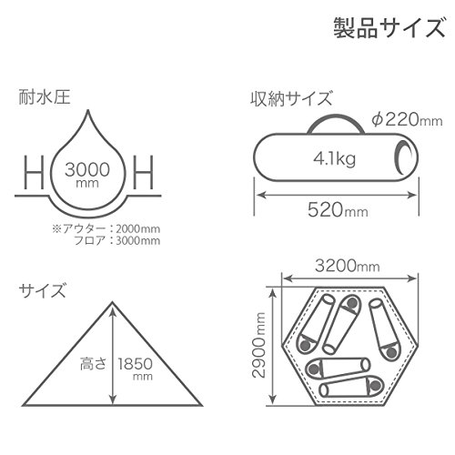 <商品スペック> 本体サイズ:約330×330×高さ270cm インナーサイズ:約300×300×高さ240cm 収納サイズ:約27×27×71cm 重量:約12.5kg 材質:フライシート/75Dポリエステルリップストップ(耐水圧3000mm) インナー/T/C フロア/ターポリン ポール/径25mmスチール 付属品:プラペグ16本、自在付ロープ8本、ハンマー1個、収納ケース