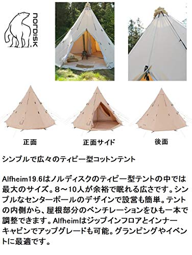 出典: https://www.amazon.co.jp/NORDISK-%E3%83%8E%E3%83%AB%E3%83%87%E3%82%A3%E3%82%B9%E3%82%AF-%E3%82%A2%E3%83%AB%E3%83%98%E3%82%A4%E3%83%A019-6-8%EF%BD%9E10%E4%BA%BA%E7%94%A8-142014/dp/B00C0TE622/ref=sr_1_8?ie=UTF8&qid=1482324109&sr=8-8&keywords=%E3%83%AF%E3%83%B3%E3%83%9D%E3%83%BC%E3%83%AB%E3%83%86%E3%83%B3%E3%83%88NORDISK(ノルディスク) Alfheim(アルヘイム) 19.6 Basic 旧Sioux(スー) 8-10人用テントは、 大人数用におすすめのワンポールテントです。 Alfheim(アルヘイム)の由来は、北欧神話において光の妖精(エルフ)の住む国からきていて、 天井部分が開閉できるので、星の観察ができます。 テントの中は、ジッパーをしめて複数の部屋に分けることができます。 ジッパーをしめず、少人数でゆったりと使うこともできます。 ジップインフロア・インナーキャビンは別売です。