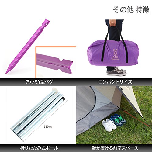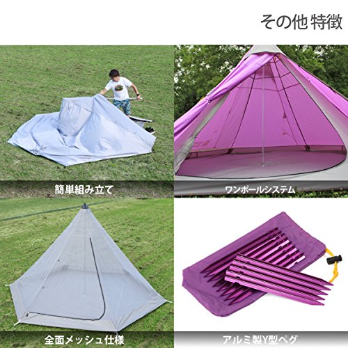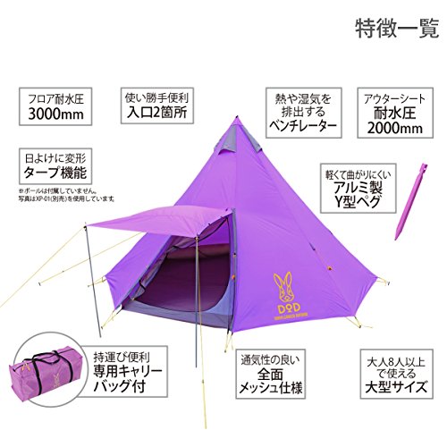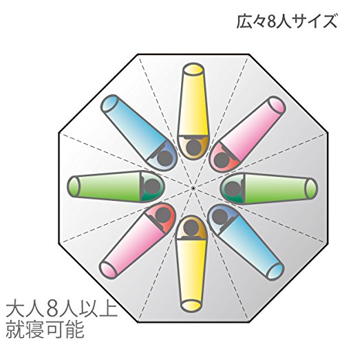 <商品スペック> カラー:パープル 組立サイズ(外寸):(約)W4600 × D4600 × H3000mm インナーサイズ:(約)W4500 × D4200 × H3000mm 収納サイズ:(約)600×直径240mm 重量(付属品含む):(約)8.8kg 収容可能人数:大人8名 最低耐水圧:アウター/2000mm フロア/3000mm 材質:生地/75Dポリエステルタフタ ポール/スチール 付属品:アルミ製Y型ペグ、ストームロープ、キャリーバッグ、取扱説明書