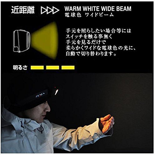 ゼクサスのZX-280です。 価格は5,349円程度(2017/11/2現在) 単四電池3本使用 180ルーメン 5時間点灯 センサー付きでサブLEDから点灯するヘッドライトです。 手元と足元で光り方が変わる距離センサーが好評です。