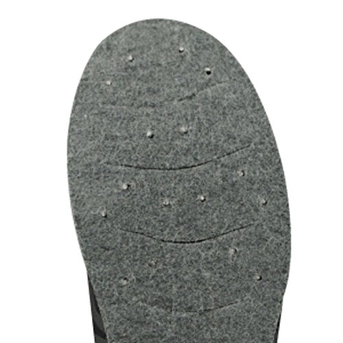 先ほどのラジアルソールに凹凸のついたスパイクを埋め込んでいるソールです。 このソールの選び方は、地面にスパイクのグリップが食い込むようになっているので、より滑りにくく、磯や山道など地面に凹凸があり歩きにくい場所などがおすすめです。 逆に、凹凸によって抵抗が強いため、船や防波堤では疲れやすく、場合によっては(船など)使用制限があることもあります。