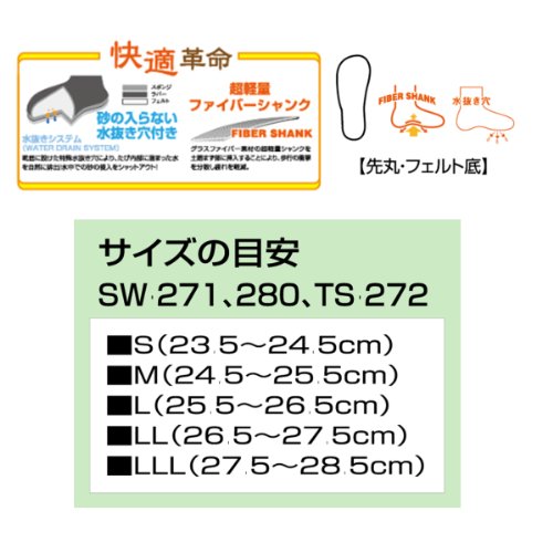 こちらのウェーディングシューズは幅広タイプのものなので、足の横幅が広いという方に適しています。また、ソールはピンフェルトを採用しているため、滑りやすい中下流でも利用可能。