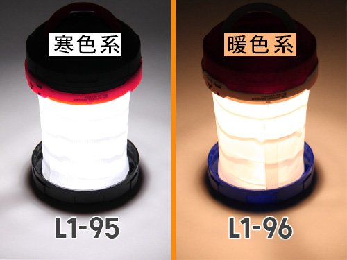 <商品仕様> ●カラー:【L1-95】 ブラック×オレンジ 【L1-96】 トリコロール ●サイズ:ランタン時 D 85×H 132(mm) 折りたたみ時 D 85×H 50(mm) ●重量(付属品含む):約 140g ※乾電池は含まず ●材質:樹脂部 ABS ホヤ部 ポリエステル ●連続点灯時間:ハイモード 約 25時間 エコモード 約 60時間 ●明るさ:【L1-95】 白色系LED(6500K) ハイモード 約 100ルーメン エコモード 約 25ルーメン 【L1-96】 暖色系LED(3000K) ハイモード 約 100ルーメン エコモード 約 25ルーメン ●電源:単3アルカリ乾電池×3本(別売)
