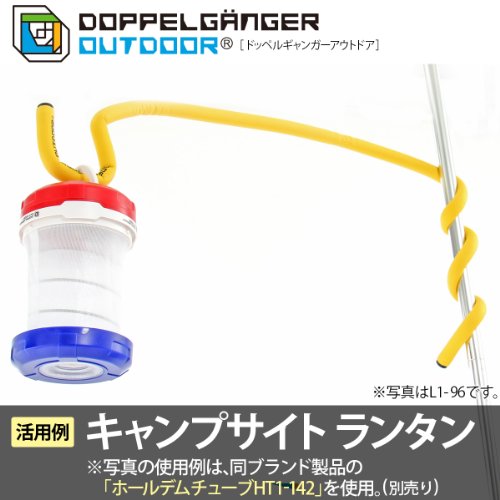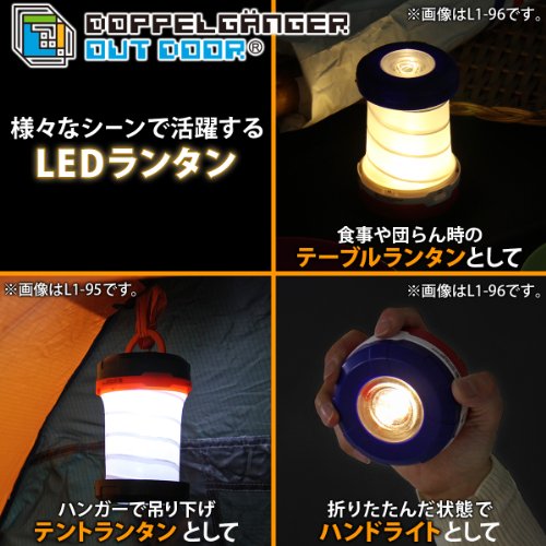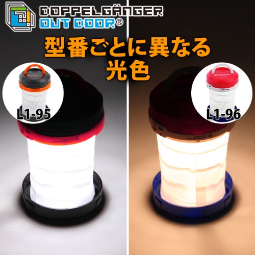 ドッペルギャンガー アウトドア ポップアップ 2WAY LEDランタンは、折りたたんで簡単に携帯できて、 1台で色々な光を演出できるおすすめのLEDランタンです。 キャンプサイトで必要となる色々な光が演出できるので、メインランタンやテーブルランタンとしても 使えますし、据え置きでも吊り下げでも、ハンドライトとしても活躍してくれます。 ポリエステル製のメッシュ生地がホヤ(グローブ)部に使われているので、 折りたためて小さくまとまりますが、天面の大型レンズから光を通すことでハンドライトとしても 使えます。 クールなブラック×オレンジとカラフルなトリコロールの2タイプのカラーバリエーションで、 キャンプサイトをお好みのイメージにするためのアクセサリーとしても活躍してくれること 間違いなしです。 L1-95は、太陽光(5500K)よりわずかに青みがかった6500Kの寒色系ホワイトの光の色みで、 オフィスや公共施設で使用されるLEDと同程度の色みになります。 対象物を明るく照らすことができるので、色や形を正確に映し出す効果や集中力を高める効果があります。 L1-96の光の色みは、電球と同じ3000Kの暖色系です。 やわらかく温かみのある光は、ガスランタンのようでリラックスできる空間を演出してくれます。 食べ物を美味しそうに見せる効果が暖色系のLEDにはありますので、テーブルライトにおすすめです。
