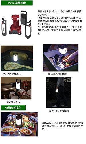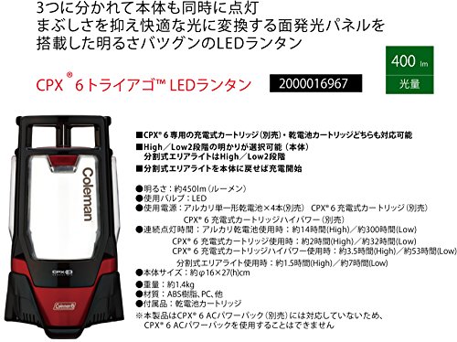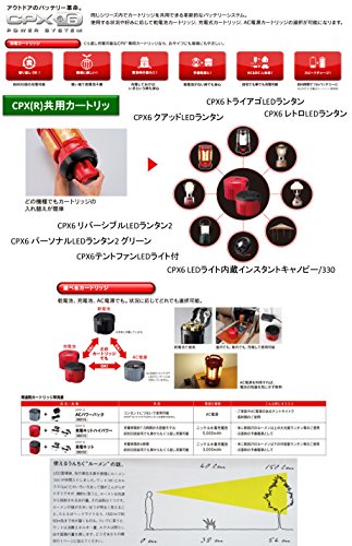 <商品仕様> ●明るさ:約 500lm(ルーメン) ●使用バルブ:LED ●サイズ:約 ø16×27(h)cm ●重量:約 1.4kg ●材質:ABS樹脂、PC、他 ●連続点灯時間:アルカリ乾電池使用時 約 13時間(High)/約 300時間(Low) CPX:registered:6充電式カートリッジ使用時 約 1.5時間(High)/約 20時間(Low) CPX:registered:6充電式カートリッジハイパワー使用時 約 2.5時間(High)/約 43時間(Low) 分割式エリアライト使用時 約 1.5時間(High)/約 13時間(Low) ●使用電源:アルカリ単一形乾電池×4本(別売) CPX:registered:6充電式カートリッジ(別売) CPX:registered:6充電式カートリッジハイパワー(別売) ●防水性能:IPX4対応(水没以外の雨や水しぶき等あらゆる天候で使用可能) ●分割式エリアライト充電時間:約 7時間 ●対応収納ケース:ランタンケース/M(レッド)