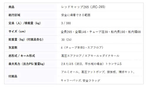 ジョイクラフトのレッドキャップ265です。 価格は188,190円円(2017/11/3現在) 全長265cm 重量30kg 2馬力にぴったりのモデルです。 手軽に楽しめる軽さと価格で人気の高い製品です。
