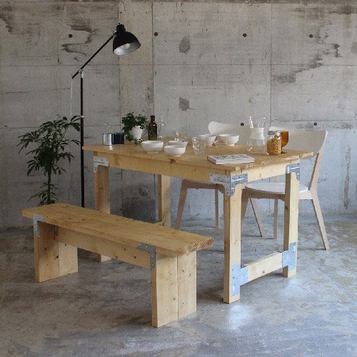 STEP3:平らな面に、クロスランバーと脚の2つのエンドフレームを構成します。図を参照しながらすすめましょう。 STEP4:2つのエンドフレームを垂直に立てて、シート部材とテーブル部材を固定します。