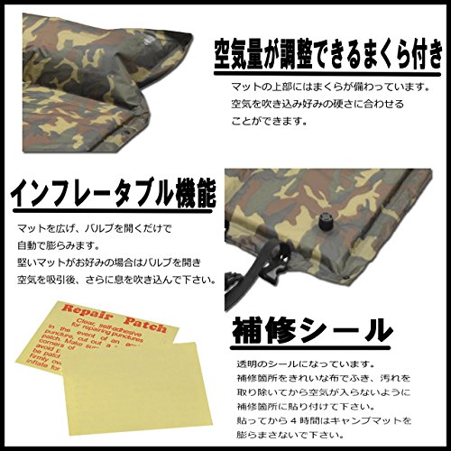 出典: https://www.amazon.co.jp/cocomohouce-%E3%82%B3%E3%82%B3%E3%83%A2%E3%83%8F%E3%82%A6%E3%82%B9-%E8%87%AA%E5%8B%95%E8%86%A8%E5%BC%B5%E5%BC%8F-%E3%82%A8%E3%82%A2%E3%83%9E%E3%83%83%E3%83%88-%E3%82%AD%E3%83%A3%E3%83%B3%E3%83%94%E3%83%B3%E3%82%B0%E3%83%9E%E3%83%83%E3%83%88-%E3%82%A8%E3%82%A2%E3%83%BC%E3%83%9E%E3%83%83%E3%83%88/dp/B01FVED4DO/ref=sr_1_12?s=sports&ie=UTF8&qid=1485523831&sr=1-12&keywords=%E8%BB%8A%E4%B8%AD%E6%B3%8A+%E3%83%9E%E3%83%83%E3%83%88空気を吹き込んで、お好みの硬さに調整できる枕が、マットの上部に備わっています。 付属の補修シールは透明のシールです。 補修する箇所をきれいな布でふいて汚れを取ってから、空気が入らないように貼って補修できます。 補修シールを貼ってから、4時間は膨らまさないでください。