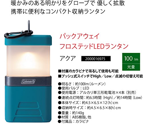 ■種類 :led ■ブランド:コールマン ■商品名 :パックアウェイ:registered: フロステッドLEDランタン ■価格 :¥3,542(税込み) ■サイズ :約4.5×6.5×12(高さ)センチ 【収納時】約4.5×6.5×8(高さ)センチ ■重さ :約140グラム ■明るさ :約100ルーメン ■素材 :ABS樹脂、他 ■商品概要 【点灯時間】約6.5〜約14時間 【使用電源】アルカリ単三形乾電池/4本(別売) ■付属品 カラビナ --------------------------------------------------------------- 収納性が高いledランタンです。 コンパクトになること以外にも、優しく明かりを灯してくれます。光量もしっかりと確保されているので、使い勝手のよいledランタンです。