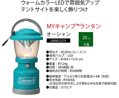 ■種類 :led ■ブランド:コールマン ■商品名 :MYキャンプ:tm:ランタン ■価格 :¥1,598(税込み) ■サイズ :約Φ8 ×15(高さ)センチ ■重さ :約124グラム ■明るさ :約20ルーメン ■素材 :ABS樹脂、他 ■商品概要 【点灯時間】約40時間 【使用電源】アルカリ単三形乾電池/4本(別売) 【防水性能】IPX4対応(水没以外の雨や水しぶき等あらゆる天候で使用可能) ■付属品 カラビナ --------------------------------------------------------------- 可愛らしいデザインでキャンプシーンを彩ってくれるこちらのledランタン。 優しい灯りがくつろぎの空間を演出してくれるはずです。テント内ランタンとしておすすめです。