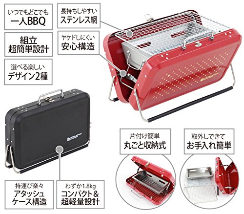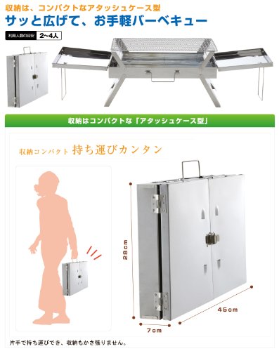 サッと広げて、お手軽にバーベキューができます。 耐久性のあるステンレスボディーでサビにくく耐久性に優れ、より長く使えます。 収納はコンパクトなアタッシュケース型です。組立ても簡単で、どこへでも簡単に持ち運べます