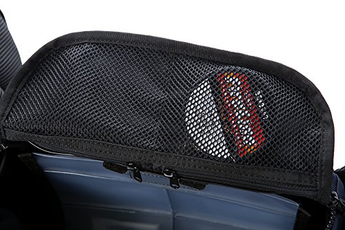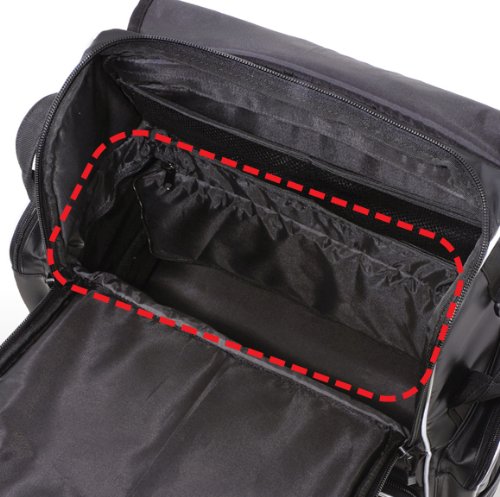 VS3010や小物など収納できる前面ポケット。バッグ底部にレインカバーが収納されたファスナーポケット付き。メイン収納部と前面ポケット内部にはメッシュの内ポケット付き。バッグ背面は通気性の良いメッシュ素材。