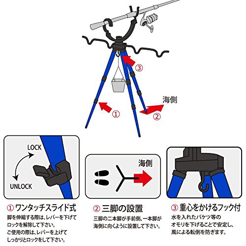 ファミリーでお出かけの際には 複数の釣り竿を立て掛けておける 三脚を用意しておくと便利です。 磯竿、投げ竿どちらもセットできます。 竿が斜めになるので 角度が付いて 魚のアタリを確認しやすくなります。 釣り竿やリールは 直接地面に置くと 傷付いてトラブルの原因になるので なるべく立て掛けて置くようにしてください。