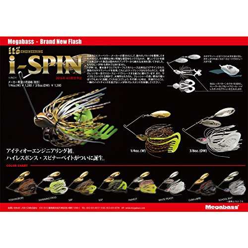 メガバスのiスピン Wです。 価格は1,243円(2017/11/14現在) 特殊なラバーを持つ カエル系スピナーベイトの シングルブレードモデルです。 立ち上がりとレスポンスを 重視し水面からミドルまでを 攻略します。