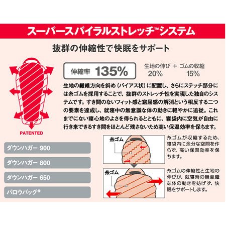 出典: http://webshop.montbell.jp/goods/list.php?category=224500洗濯などのメンテナンスも比較的容易で、優れた快適性を実現。保温性と速乾性を併せ持ったモデルです。 エクセロフトという3種類の異なるポリエステル繊維綿をブレンドした柔らかく、回復力と保温力に優れた、特殊な化繊モデルです。 ファミリーキャンプ向けで、登山する人でこれを選ぶ人はあまりいません。#0~#3はかなり大きくなります。ただ価格はダウンに比較して安いので、積載量に余裕のある車移動のキャンプする方にはおすすめです。 スーパースパイラルストレッチシステムが採用されています。