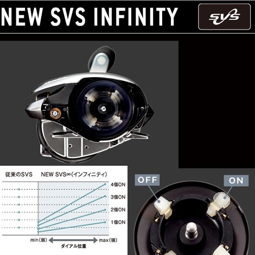 新しいマグナムライトスプールを搭載して飛距離が20%もアップしたといわれています。NEW SVS∞(インフィニティ)の機能により外部ダイヤルで簡単にブレーキセッティングができるようになりました。 ノーマルギア ・ギア比 6.2 ・最大巻上長(cm/ハンドル1回転) 66 ハイギア ・ギア比 7.4 ・最大巻上長(cm/ハンドル1回転) 79 エキストラハイギア ・ギア比 8.5 ・最大巻上長(cm/ハンドル1回転) 91 共通項目 ・自重(g) 175 ・ナイロン糸巻量(lb-m) 12-100、14-90、16-80、20-65