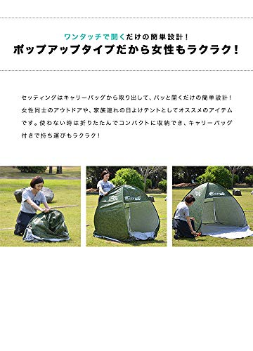 パッと設営、5秒で撤収! 女性や小学生でも 簡単に設置できる、2~3人用のポップアップ簡単テントです。 UVカートコーティング採用で UVカートと日除けの効果がよいサンシェードテントです。 小雨の時のアウトドアでも大丈夫ですよ。