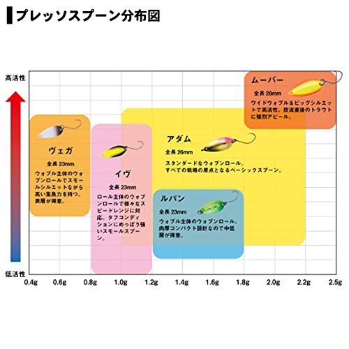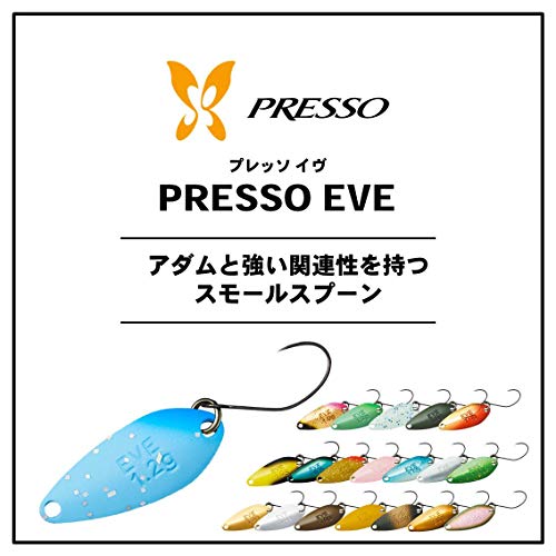 ダイワのプレッソ アダム1.8gです。ダイワのプレッソシリーズからも 複数のスプーンが展開されています。 タックルからワレットまで、 関連製品を統一出来るので 初めてに選ばれるケースが多い 人気の製品です。 ハイピッチのロールアクションで やる気のある魚を見つけましょう!