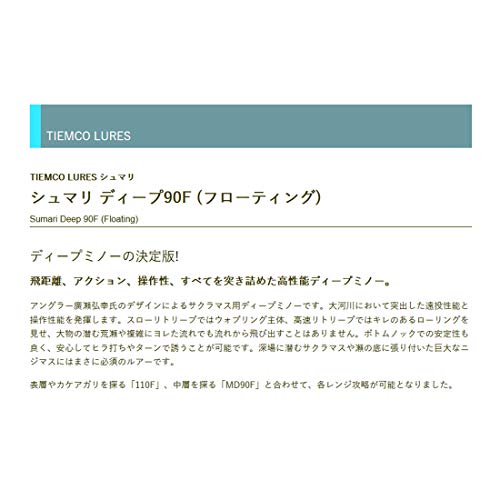 ティムコのシュマリ90Dです。本流向け、 飛距離と操作性を重視した ディープレンジミノーです。 サクラマス向けに開発された 専用ルアーとして 高い基本性能を備えています。 ノーマルモデルとMDモデルで 深場からカケアガリまで 夢の魚を手に出来るルアーです。