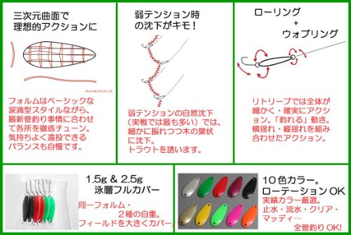 ひらひらと揺れながら泳ぐ リトリーブ、フォールを メインに使用します。 対象となるトラウトのサイズ、 釣り方によって形状から厚みまで かなりの種類が ラインナップされているのも特徴。 無数のカラーからどんどん ローテーションして テクニカルな釣りを 楽しめるルアーです。