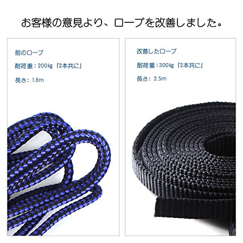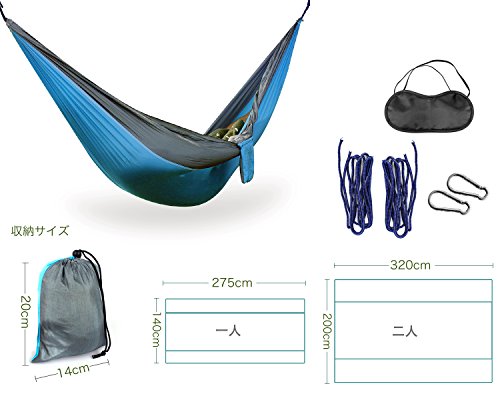 サイズは2種類あり、大きい方は、幅が200㎝、耐久重量が250㎏ある為、横向きに大人3人が入ることもできます。 価格もリーズナブルで、13色展開しているので、色違いで持っていてもいいですね。 ロープにカラビナ、アイマスクまでセットになっています。コンパクトで軽量なので、キャンプにおすすめです。