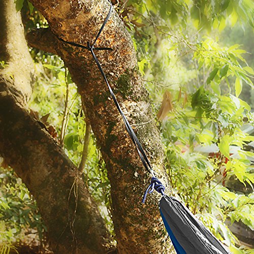 軽量な高密度のナイロンを使用しています。 軽量でありながらワイドなサイズなので、ゆったりと過ごせます。 別売りのスタンドで、片方は木に吊るし、片方はスタンドに吊るすということもできます。この方法だと、木の間隔を気にしなくて好きな場所に設営できますね。