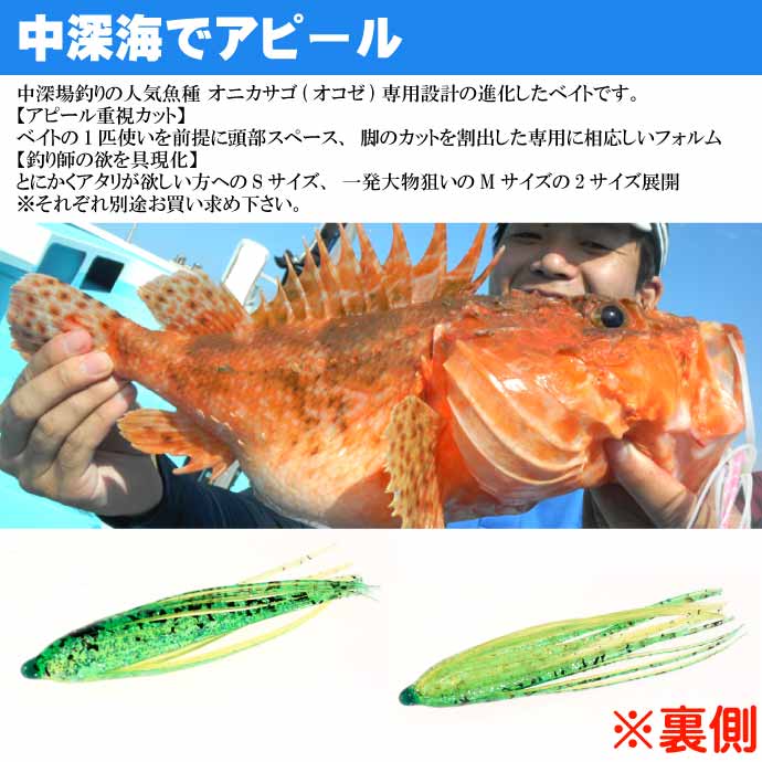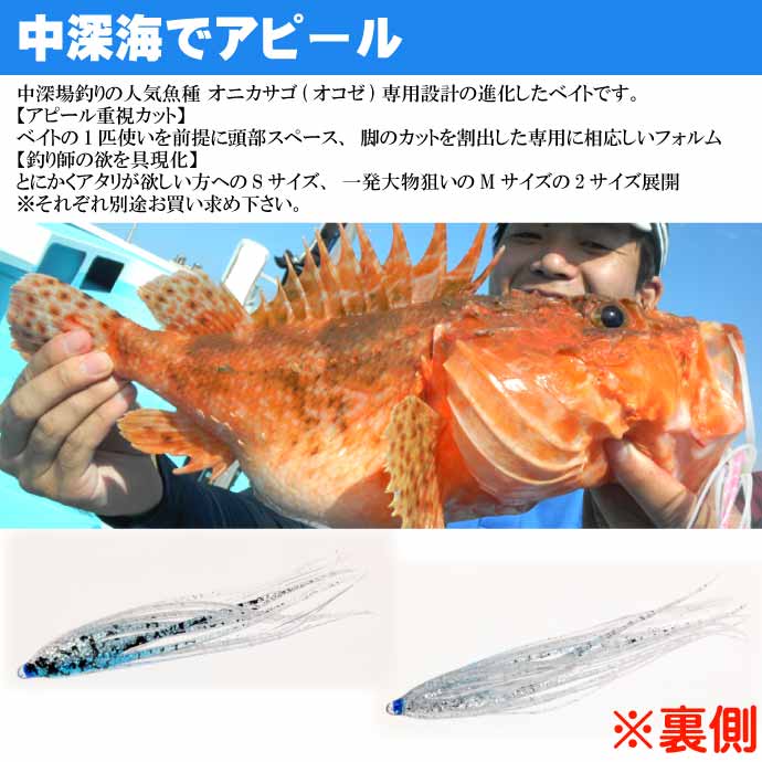 イカを短冊状にカットした釣りエサ、イカタンもオニカサゴでは人気の釣りエサです。 身に粘りが合ってエサ取りに強いので、魚のカットと合わせてハリにつけてもOKです。 オニカサゴ釣りはイカ竿でも楽しめるので、オニカサゴとのリレー船もあり、 船上でカットして用意する事も出来るエサです。