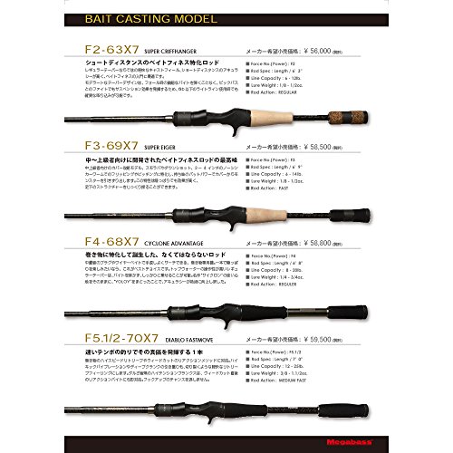 <ランキング4位> メガバスロッド 表記 DESTROYER X7 F2-63X7 メガバスロッド DESTROYER X7 F2-63X7は、2015年モデルが最新モデルとなっており、全4モデルが発売している。その中で、特にF2-63X7をおすすめしたいと思っています。 こちらのモデルは、ショートディスタンスのベイトフィネス特化ロッドということで、「ベイトフィネス」とは、これまでベイトロッドと言えば重めのルアーをキャストすると言う用途で使われていたと思うのですが、技術革新により強靭な硬さもあるもののしなやかさも非ではなく、凄く軽いルアーをキャスト出来るようになったことから、その釣り方をベイトフィネスと呼びます。