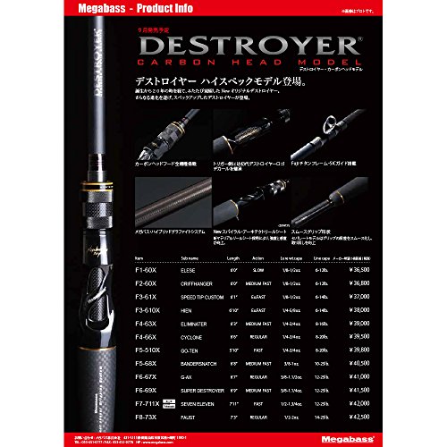 <ランキング6位> メガバス 表記 The ALL NEW デストロイヤーF5-68X サブネームがBANDERSNATCH バンダースナッチとは、架空の生物と言う事らしくその動きは俊敏なのだとか。 このBANDERSNATCHも俊敏に動きを連想させる逸品なのだと思います。 Actionがミディアムファストと言う事で、ビギナーにも扱いやすいロッドではないでしょうか。 こちらのロッドも、メガバス20周年Newデストロイヤーですが、Newデストロイヤーは伊東由樹社長の力の入り具合が半端ないように感じます。 そして、硬さのあるロックや消波ブロックなどのハードボトムに強く、1/2オンス程度のスピナーベイトのブレードの回転を明確に伝えてくれると言います。 インプレ評価としては、良く飛んでくれる飛距離と万能に使えるといったところです。