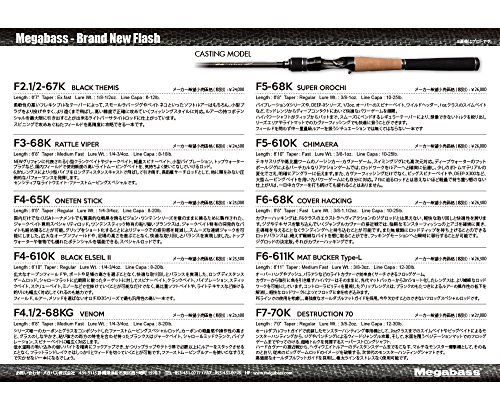 <ランキング5位> メガバス 表記 The ALL NEW DESTROYER F6-67X F6-67Xですが、こちらもベイトフィネスと呼ばれ、柔軟な硬さをもつロッドで、重ためのルアーや軽量なルアーまでをカバーできて、ロングディスタンスのベイトフィネスなので、長距離(飛距離が伸びる)でも細やかなバイトを見逃さないロッドと言うことです。 重ためのルアーもキャスト出来る分、ファーストテーパーではなく少しレギュラーテーパーよりになっているのだと言います。 小型の4gから7g程度のプラグを、30mくらいは普通にキャスト出来て、6ポンドから8ポンド程度のラインを使うのがベストになってきます。 6ポンドから8ポンドと言えば、普通にスピニング用の太さかと思ってしまいますが、このF3-67Xであればそれも可能だと言う事なんですね。 ラインをサイズダウン出来ると言う事は、バスに気付かれにくくダウンショッリグトやテキサスリグのようなライトリグでの攻めが、このベイトキャスティングロッドで可能だと言う事だと思います。 ベイトフィネスと聞くとカバーに送り込むと硬さのあるロッドは折れてしまうようなイメージですが、カバーの中からグッと引き出せるような強靭な硬さとパワーを持っているのだそうです。 そして、キャスティングしたポイントがロングディスタンスであっても、フィネスリグの感度を感知できると言うとても優れた高感度なロングディスタンスベイトフィネスだと言えます。 このあたりは、かなり評価できるポイントなんではないでしょうか。 インプレ評価としては、サブネームである「ICBM」を気に入って使用されている方が結構多いようです。