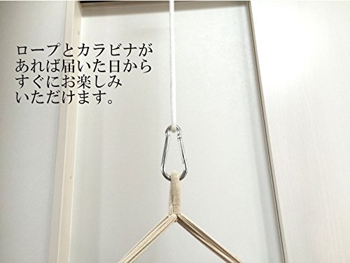 極太コットンロープと天然木のチェアハンモックです。 座りながら、宙に浮かんだような独特の浮遊感を味わえるのが特徴です。こちらは梁や木に吊すためのナイロンロープセットなので室内設置の場合は設置後すぐに利用が可能に。 通常のハンモックと違い、ロープの編み方を前後で変えていて座ったときにお尻から背中までのフィット感を感じられるように工夫されています。また、ずっと座っていても疲れないような設計もされています。 見た目のデザインも、ほか商品にはないデザインですし疲れないような設計であれば読書やリラックスする道具として利用ができると思います。 また、ご自宅のインテリアに凝っている方でしたら南国イメージのお部屋にぴったりではないでしょうか。 ※写真にあるクッションは付属していません。また、スタンドも別売りです。