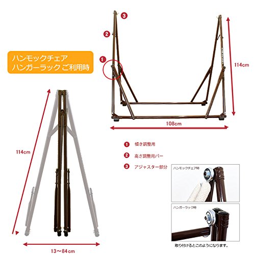 ◆素材 ・生地(ハンモック、チェア):綿65%、ポリエステル35% ・スタンド:スチール ・ハンガーロッド:アルミ ・収納バッグ:ポリエステル ◆耐荷重 ・90kg ◆セット内容 ・スタンド ・ハンモック用生地 ・チェア用生地 ・ハンガーロッド ・収納バッグ