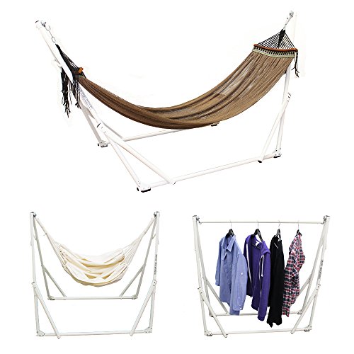 この商品の人気の理由は、なんとハンモックチェアでも200Kgまで耐荷するというもの。ハンモック時は330Kgまでですのでかなり丈夫に作られているのが特徴です。一般的な商品が100Kg前後なので倍以上耐えてくれます。また、もう一つの人気の理由は3WAYということ。ハンモックチェアの他にハンモック、ハンガーラックとして利用可能です。 こちらのシリーズはほかにもロングタイプやミニタイプもありますので、自立式スタンドをつかってご家族で楽しんでみてはいかがでしょうか。