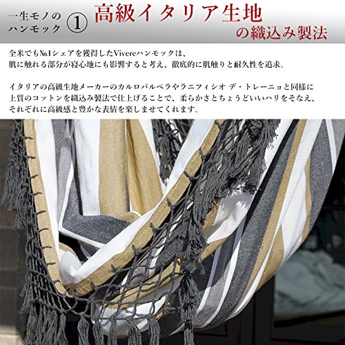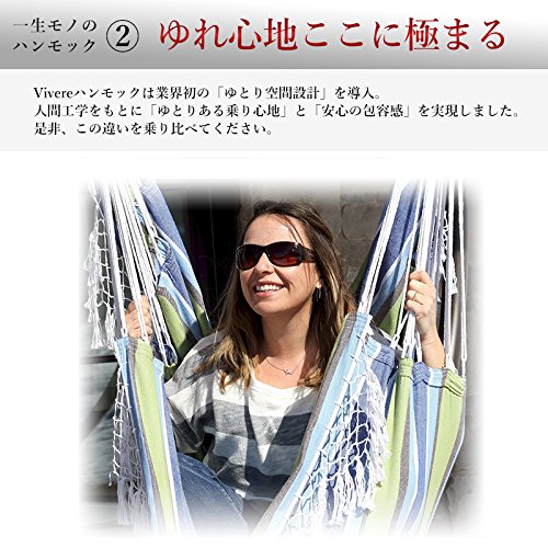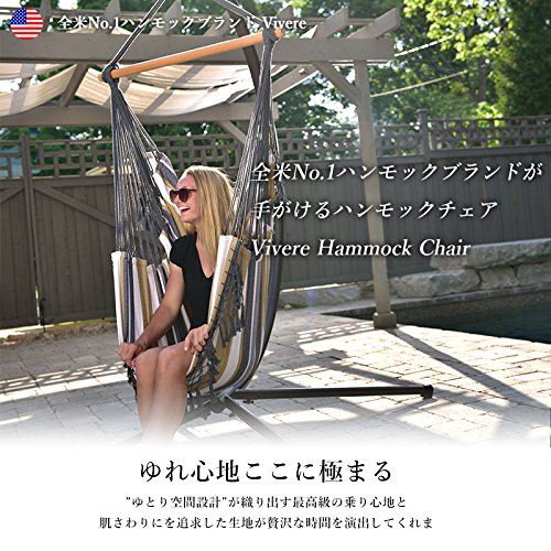 全米一のハンモックメーカー、Vivereがプロデュースしたハンモックチェアです。 ゆとり空間設計で、ゆれ心地を追求しているのが特徴です。生地はイタリアの高級生地メーカーと同様に上質コットンの織込み製法を採用していて、こだわりが詰まっています。 生地と揺れ心地に力を入れているハンモックチェアなので、ぜひ自立式スタンドでも使ってみてはいかがでしょうか。 ※スタンドは別売りです。
