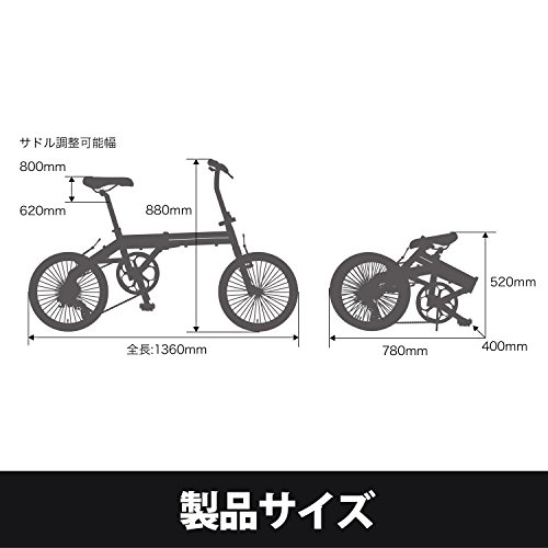 ・全長:1550mm ・重量:14.5kg ※ペダル、保安部品を取り外した状態。 ・サドル高:570〜880mm ・ハンドル高:930〜1000mm ・ハンドル幅:520mm ・タイヤサイズ:20×1.75inch ・フレーム材質:スチール ・フロントフォーク材質:スチール ・変速機:シマノ7段変速 ・ペダル:固定式ペダル