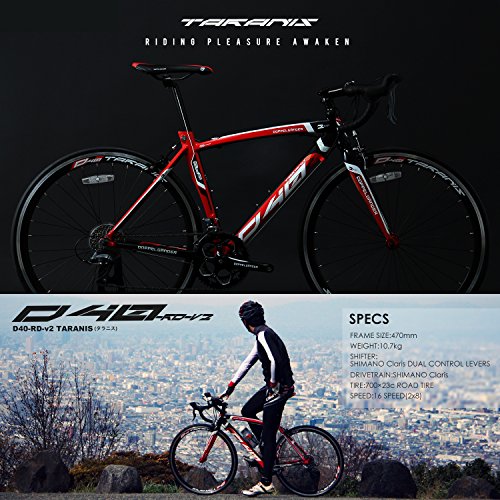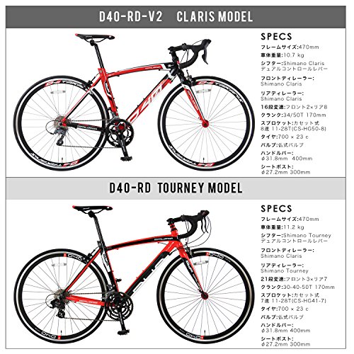 •フレームサイズ:470mm •車体重量: 10.7 kg •シフター:Shimano Claris デュアルコントロールレバー •前後ディレーラー:Shimano Claris •16段変速(フロント2×リア8) •クランク:34/50T 170mm •スプロケット:カセット式 8速 11-28T(CS-HG50-8) •タイヤ:700 × 23 c •バルブ:仏式バルブ •ハンドルバー:φ31.8mm 400mm •シートポスト:φ27.2mm 300mm