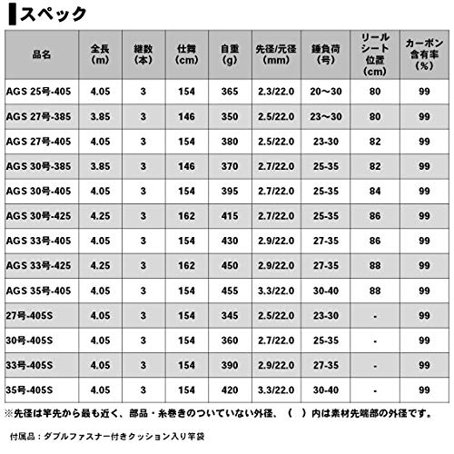 上記、トーナメントプロキャスター 30号-405を参考に 「30号-405」で説明します。 30号については、そのまま適応するオモリの重さを表しています。 405については、竿の長さ4.05mになります。