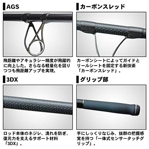 竿自重が395gと非常に軽く、感度を追及された製品です。 AGS(超軽量カーボン素材ガイド)ガイドリンクにCリングが採用されリング内面積が大きくなっていて糸の放出性能が上がっています。 (ダイワの竿の品番の見方)