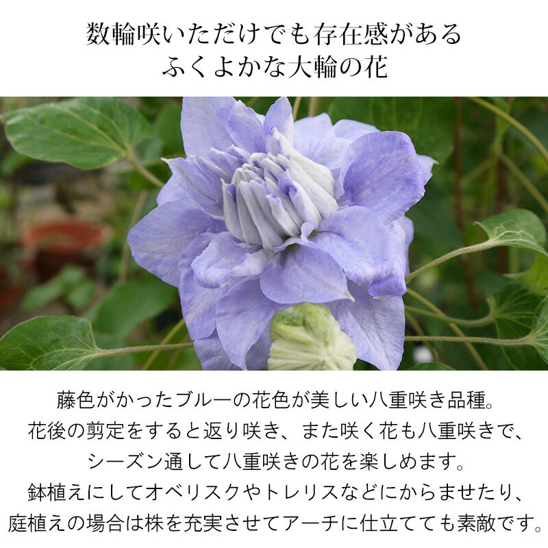 開花期 5~10月 花径 12~17cm 【旧枝咲き・弱剪定】 存在感抜群の八重咲き大輪花。花径は最大17cmにもなります。 涼しげなスカイブルーのお色で夏の花壇を爽やかに彩ってくれますよ。 強健で花つきも良く、育てやすい品種です。 弱剪定なので、花後は新枝を2節残して剪定して下さい。