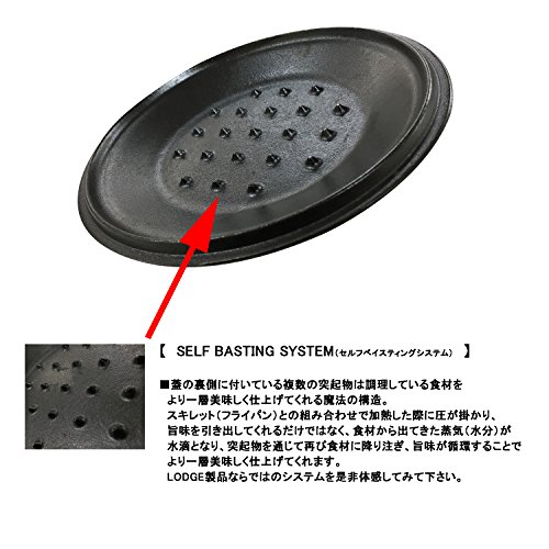スキレットにはスキレットカバーと呼ばれる蓋があります。 スキレットカバーも、スキレットと同じく鋳鉄製なので大変重みがあります。 重いスキレットカバーをすることによって、機密性が高まり、内部に圧力がかかり、硬い素材なども柔らかく調理することができます。 煮込み、蒸し焼き、無水料理・無油料理も美味しく出来ます。 スキレットカバーには、内側に突起物がついています。 調理中に素材の旨みを含んだ蒸気がこの突起にたまり、その水滴が鍋の中の食材に降り注ぐので、ベイスティングの必要がありません。(※ベイステイングとは、煮汁をスプーンなどですくって、素材にかける作業のことです。)