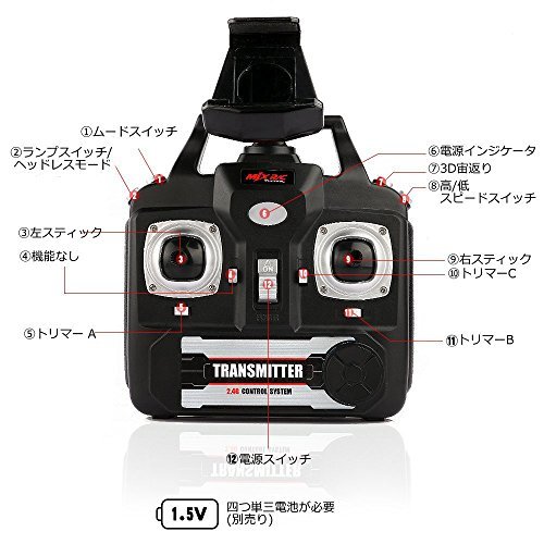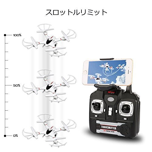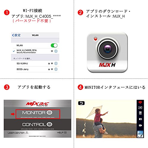 出典: https://www.amazon.co.jp/Android%E3%81%A7%E3%83%AA%E3%82%A2%E3%83%AB%E3%82%BF%E3%82%A4%E3%83%A0-2-4GHz-VR%E3%83%98%E3%83%83%E3%83%89%E3%82%BB%E3%83%83%E3%83%88%E5%AF%BE%E5%BF%9C-%E3%83%9E%E3%83%AB%E3%83%81%E3%82%B3%E3%83%97%E3%82%BF%E3%83%BC-%E3%83%98%E3%83%83%E3%83%89%E3%83%AC%E3%82%B9%E3%83%A0%E3%83%BC%E3%83%89%E6%90%AD%E8%BC%89-24%E6%9C%88%E4%BF%9D%E8%A8%BC%E6%9C%9F%E9%96%93-%E6%97%A5%E6%9C%AC%E8%AA%9E%E8%AA%AC%E6%98%8E%E6%9B%B8%E4%BB%98%E5%B1%9E/dp/B06Y439683/ref=sr_1_21?ie=UTF8&qid=1499997471&sr=8-21&keywords=%E3%83%89%E3%83%AD%E3%83%BC%E3%83%B3本体はカメラ付きで、iOS、Androidより指定のMJX FPVアプリをダウンロードして頂くことで、WIFIを通して、ご使用のスマホをリアルタイムモニターに代用することができるFPV機能付きです。 ドローンは高性能6軸ジャイロ搭載で上昇、下降、前進、後進、左回し、右回し、3Dフリップが簡単にコントロールでき、初心者でも抜群の安定性を実現します。 ヘッドレスモード搭載でドローンの機首の向きに関係なく、スティックを前後左右に動かすと機体も(どっちを向いていようが)自分から見て前後左右に動きます。知識も技能も必要なし、操縦はとても簡単です。初心者でも簡単に操縦できます。