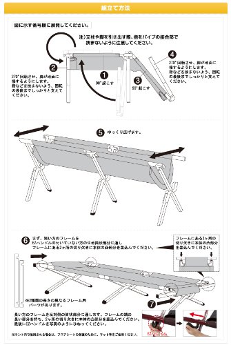 寝る人の重さでテンションがかかり安定する作りになっています。適度なクッション性があり快適な寝心地を保証します。組み立て方は折りたたまれている2本の脚を開いて、4本のパイプを両サイドにスライドするだけ。簡単に設営できてベンチがわりに使うにも便利です。