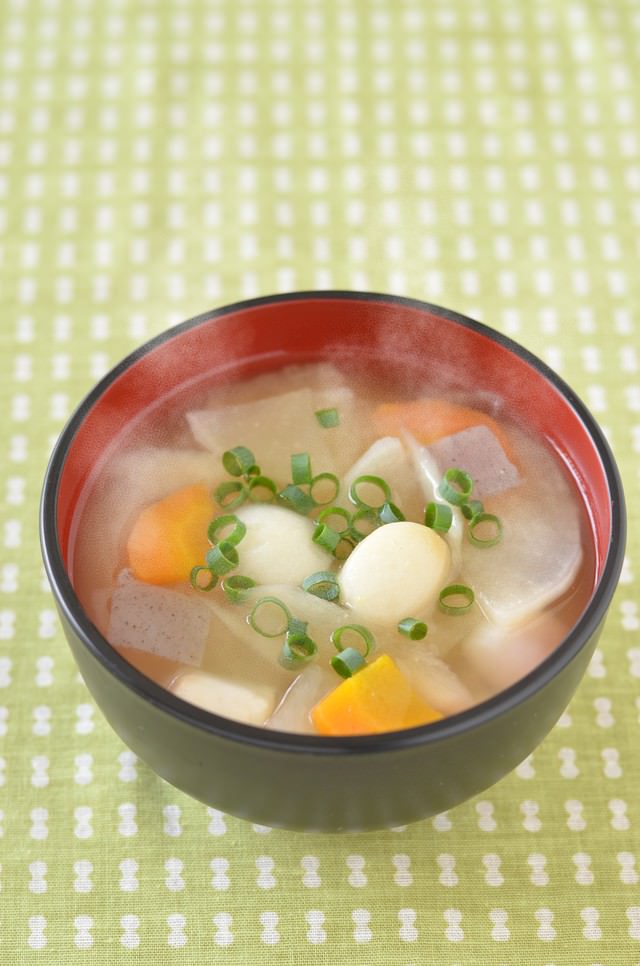 ①大根、人参は5mmくらいのいちょう切りにしておきます。さつまいもは1cm角のさいの目切りに、長ネギは1cmほどの輪切りに。こんにゃくは水気を切り少し洗っておきます。 ②鍋にごま油を入れ熱し、豚肉を炒めます。色が少し変わったら、大根、人参、こんにゃく、ねぎ、さつまいも、ごぼうを入れ炒めます。 ③油が回ったら水とだしの素を入れ、強火にします。 ④沸騰したら火を弱め、アクを取ります。中火で10分ほど煮込みます。 ⑤根菜が柔らかくなったら、味噌を加えひと煮立ちさせて、完成です。