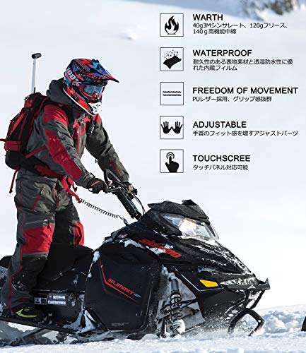 ●素材:ポリエステル、合成皮革、導電性ファブリック、コーラルフリース(TPU防水フィルム内蔵)、3Mシンサレート高機能中綿 ●機能:防水性・保温性抜群、高いグリップ力、タッチスクリーン対応、360度保温ロック ●重量:240g