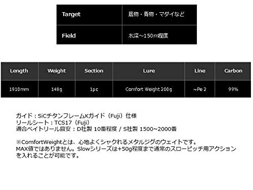 ハリと柔軟性にこだわったブランクスのセッティングで、ジグの動きを阻害せず快適なアクションを引き出す性能を持っています。200gのジグをメインに使用する設定となっていますが、250gまでのジグには問題なく対応するロッドです。