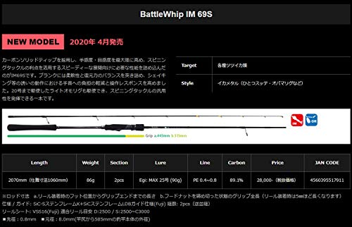 ヤマガブランクスのバトルウィップ・イカメタルシリーズが終売することになり、リニューアルモデルとして2020年に販売された「バトルウィップ・IM」です。他にオモリグモデルの「バトルウィップ・OR72/C」も同時発売されました。IM69はスピニングモデルとベイトモデルの2種があり、こちらはスピニングモデルとなります。