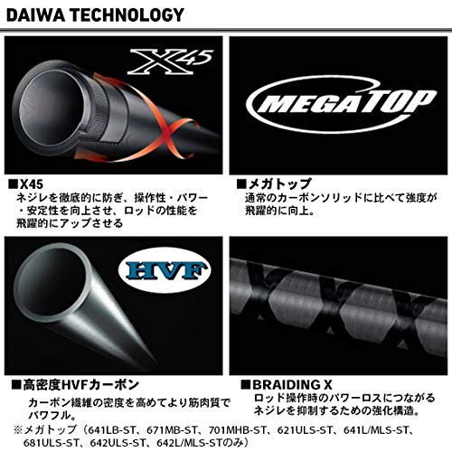 ダイワのエアエッジ 641LB-ST・Eです。 価格は15,676円(2018/1/15現在) ダイワのミドルクラス、 2017年発売のバスロッドです。 高弾性HVFカーボン、 X45やブレーディングXと 最新機種らしく新しい技術が 惜しみなく採用されています。 641LB-ST・Eは 高弾性メガトップ採用、 感度が高いので 小さなバイトもしっかり伝達、 ストラクチャータイトに バスを攻略する釣りに最適なモデルです。