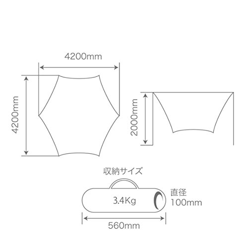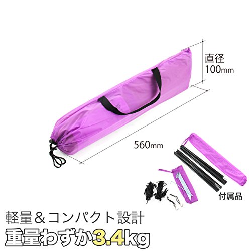 【サイズ】約420×420×230(h)cm 【収納サイズ】約17×74(h)cm 【重量】5.9㎏ 【付属品】ロープ、ペグ、ハンマー、キャリーバック。 設営が簡易。慣れてくると1人作業でも5~15分くらいで組み立てられます。遮光性・耐水性ともに抜群!もちろん、風にも強くて安心です。クロスポール採用だから初心者でも簡単に組み立てられます。