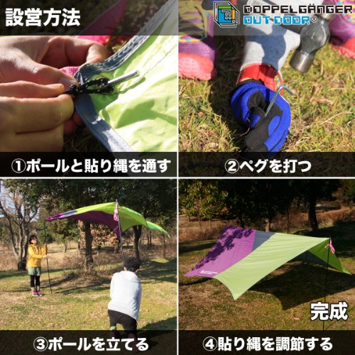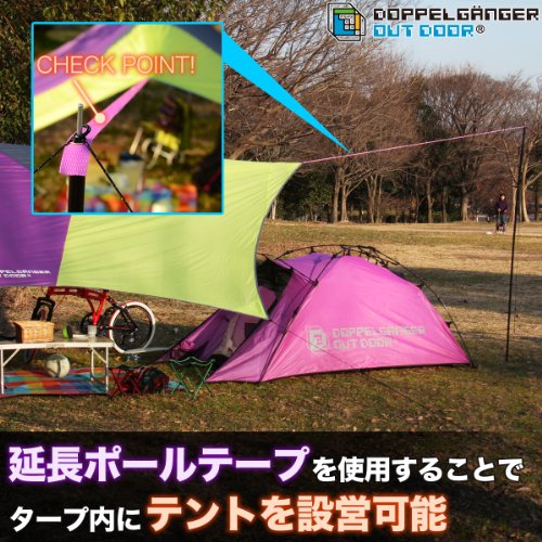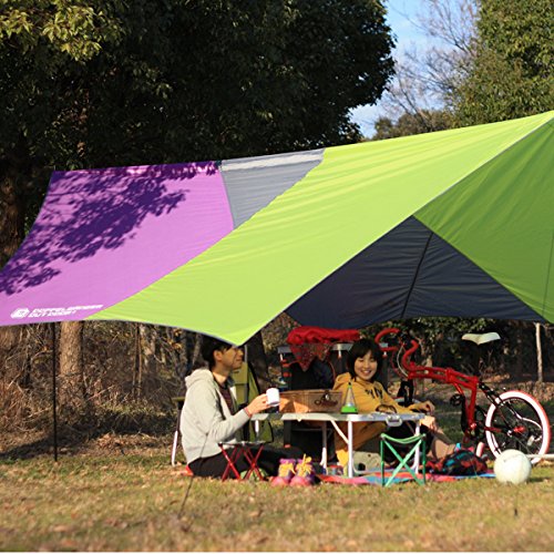 【サイズ】4200×4200×2000mm 【収納サイズ】直径100×560mm 【重量】3.83㎏ 【付属品】張り網(長・短4本ずつ)、ペグ8本、ランタンフック2つ、キャリーバッグ、取扱説明書。 目立つカラーが好評価!耐水性・UVカットは問題ありません。ただし、ポールが少し弱いそうなので、別の商品を使用した方が良さそうです。ドッペルギャンガーは色合いが派手め。このカラーリングにハマる人が続出しています。別のタープもチェックしてみてください。